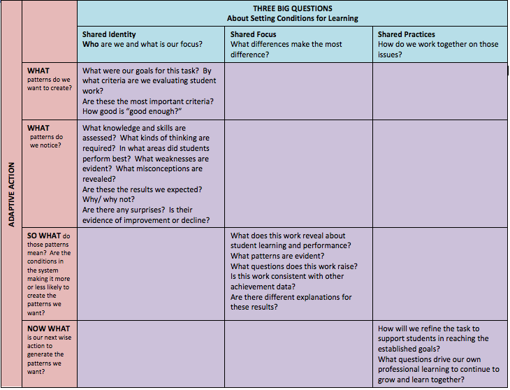 As a systemic process, this adaptive action approach to student work analysis is used across grade-levels, content curriculum coordinators and district-level leaders. It can be used within campus-based teams of teachers of like subject and cross-teams of teachers. Principals, as learners and leaders within the system, can participate in the shared agreement and decision making alongside teachers as together they seek patterns, find the tensions, and strengthen their shared identity, focus, and practices as a learning system. Students, themselves, can participate in the process to ensure their voices are heard, and they have a role in the decision-making.