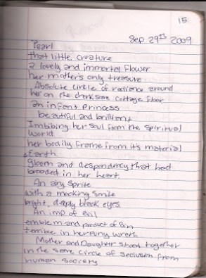 One of my favorite uses of the found poem in an English classroom is in response to difficult texts such as Nathaniel Hawthorne’s The Scarlet Letter. After reading an excerpt from “Pearl,” I invited students to highlight adjectives and phrases that Hawthorne uses to describe Hester’s strange daughter. Then, they went back to the text to glean the language that they felt was most important to create a poem using Hawthorne’s own words to represent Pearl.