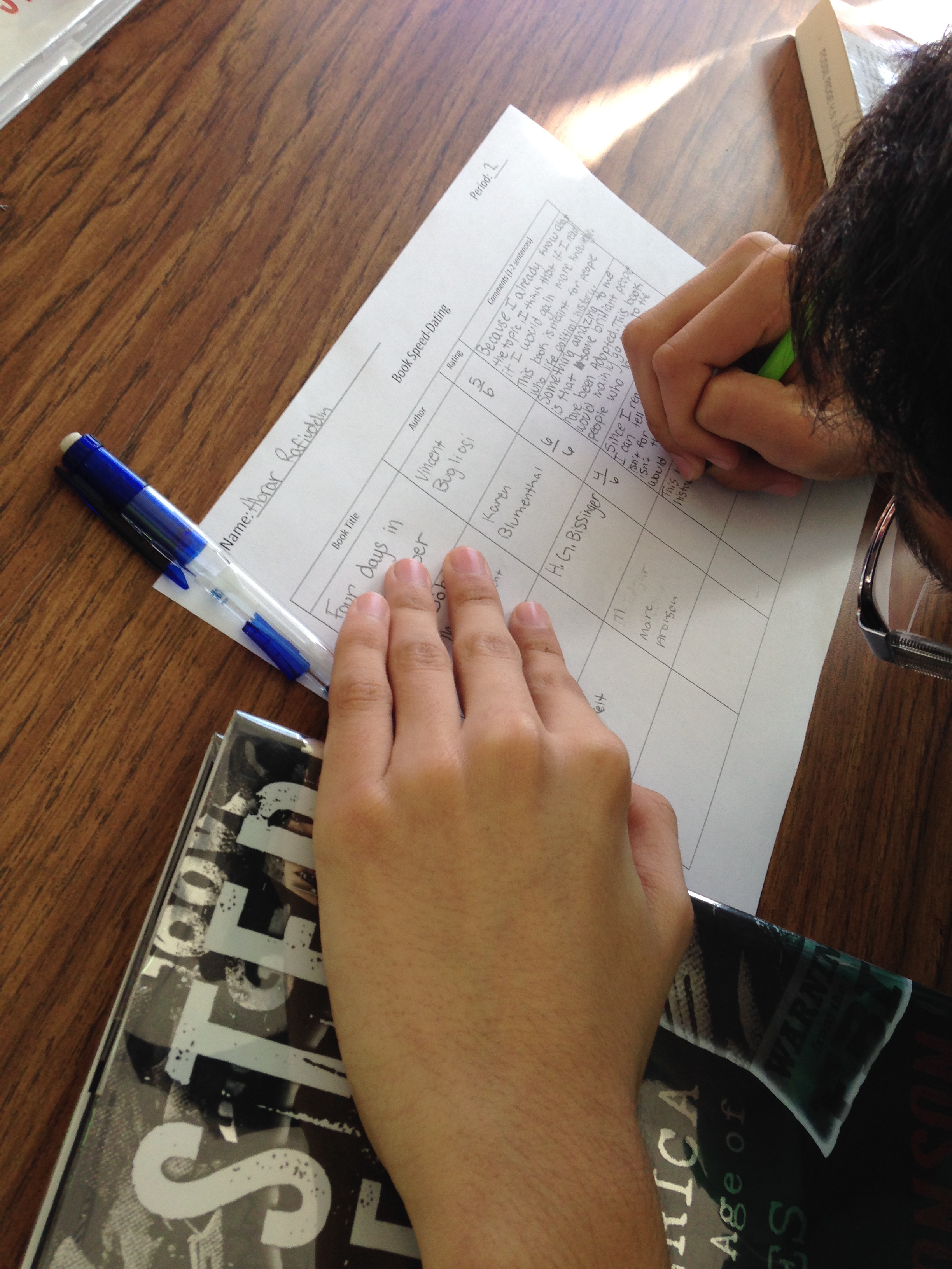 When I entered the library and brought my book pass with me, I made a few adaptations here and there. These days, I set the activity up like a speed-dating experience. We talk about how dating a book is like dating a person–you judge it by the outside, but have to remember to listen to what it has to say before you make up your mind about it. I find that teens latch on to this idea of reading relationships.