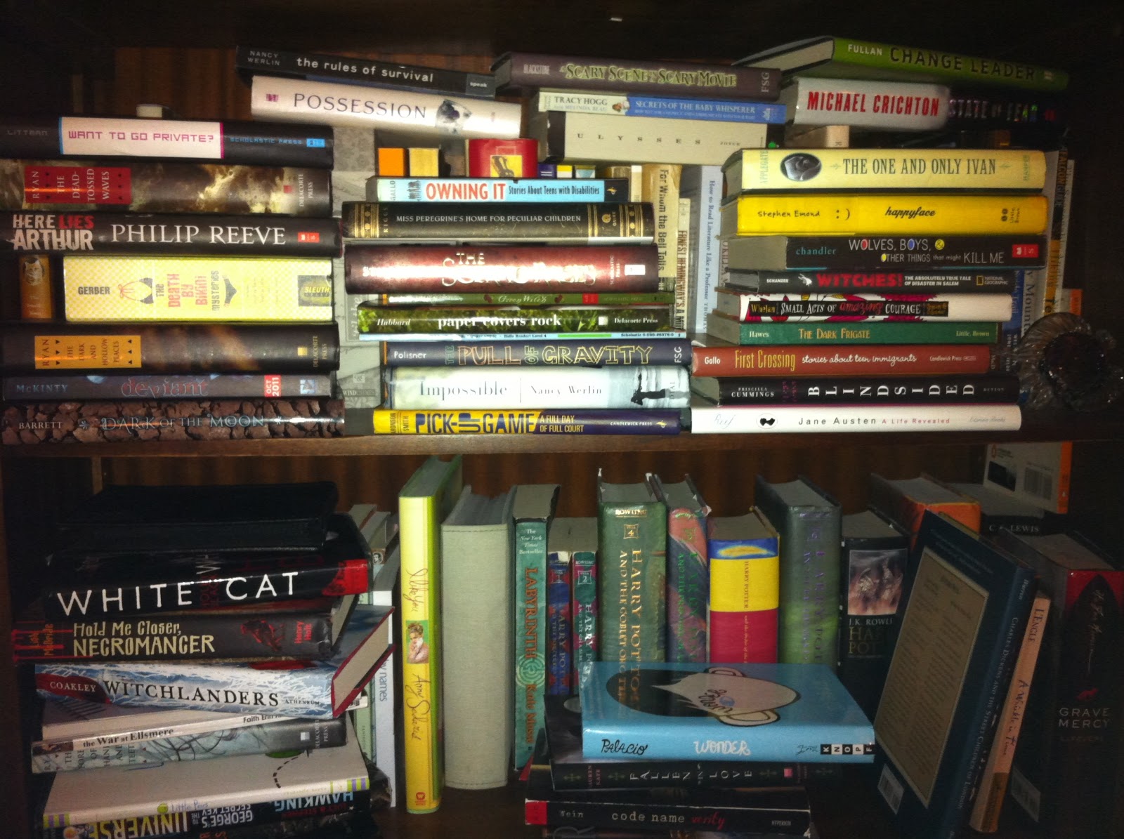 But here’s the thing…I’m getting ready to wrap up on this class. This week is our final week of assigned reading (the topic, by the way, is banned and challenged books). As I’m going back through my blog posts one last time and publishing them, my eyes keep wandering over to my TBR (to be read) stack on the book shelf that my excellent friend and reading mentor, Donalyn Miller, bequeathed to me last spring as she was packing up her classroom library in preparation of her move from 6th to 4th grade. Here’s a small sample of the greatness that awaits me: