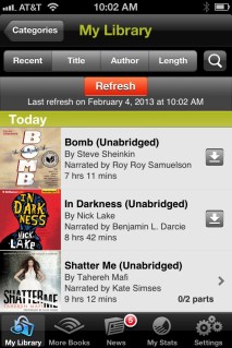Shatter Me by Tahereh Mafi (audiobook from Audible.com)…there are moments listening to this book when I am in awe at the author’s style and use of language. I don’t know if this will be an audiobook purchase for the library, however. The text employs strikeouts to convey narrator’s thought process, which is relayed through an annoying pen scratch sound in the audiobook. And, the narrator sounds too young and girl-y for my interpretation of Juliet. The story is fascinating; think Rogue from X-Men meets Juliet Capulet.